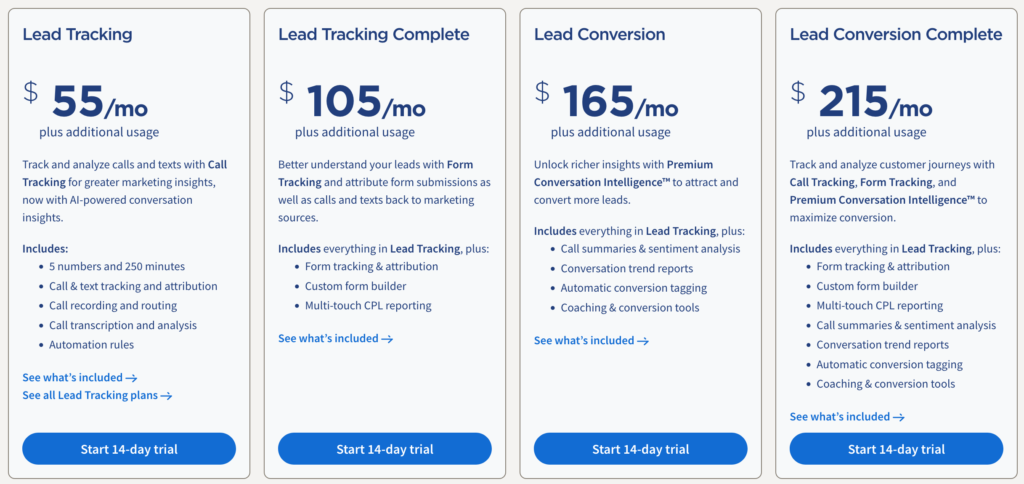 The pricing structure typically depends on the features you need, the number of tracking numbers, and usage volume. Core call tracking is usually the entry point, then additional costs can come in for extras like conversation intelligence, form tracking, and advanced analytics features.