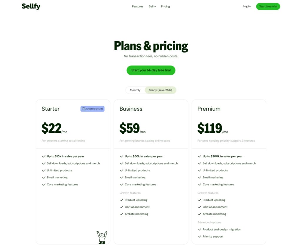 Without turning this into a price table, here’s the general idea: Sellfy works on a subscription model. You pay for a plan, and in exchange, you get access to the platform and its features. Different tiers unlock things like higher sales volume limits, more advanced features, or extra tools.